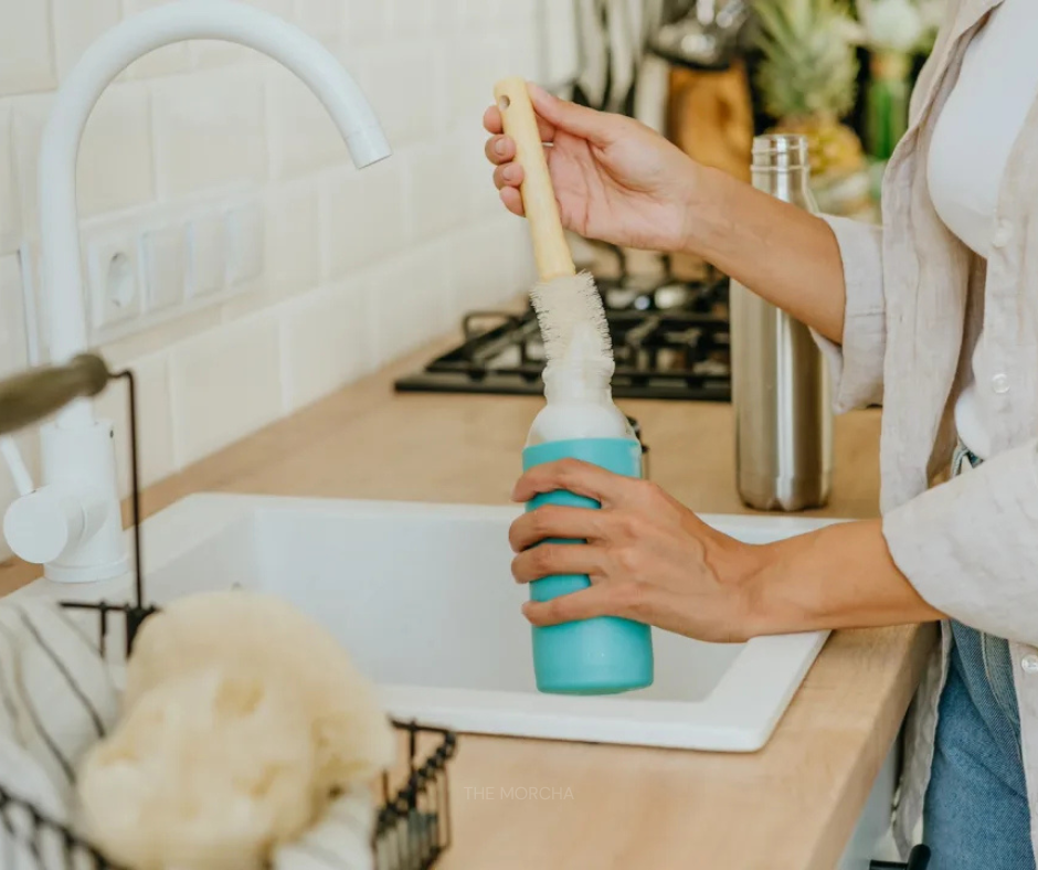 Cleaning your bottle properly does not take much time, but doing it correctly makes a big difference in hygiene. Rinse the bottle with warm water after completely emptying it. Add a few drops of dish soap and use a bottle brush to scrub the interior thoroughly, reaching the bottom and all sides. Remove the lid and clean it separately, paying close attention to grooves, threads, and any rubber seals where bacteria can hide. Rinse everything thoroughly to remove all soap residue.